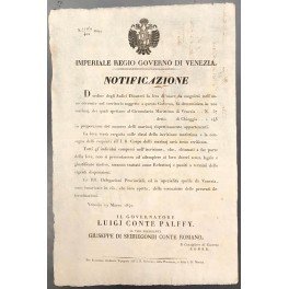 Notificazione. Imperiale Regio Governo di Venezia. La leva obbligatoria in Marina, nell'anno 1842, si attesta a 200 soldati. Tutti coloro che diserteranno verranno puniti