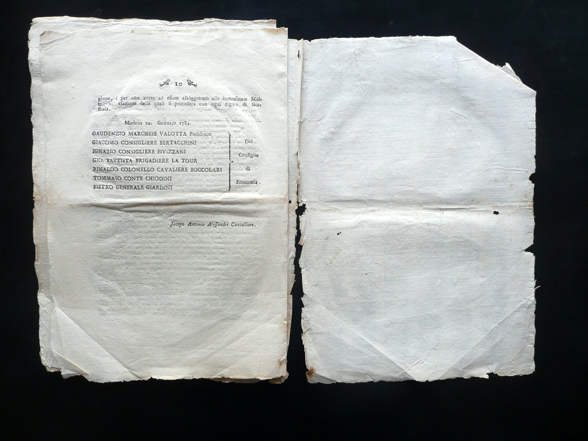 Notificazione, Notificazione Per quanto provide siano, e vigorose le Provvisioni in diversi tempi emanate, e vigenti tuttora in proposito dei Pavaglioni, o siano Mercati di Follicelli, e delle Filature da Seta in questi Serenissimi Dominii, la quotidiana esperienza purtroppo da a divedere ch'esse non sortiscono il pieno loro effetto: [.]" Modena, 1784; cm 32x23; pp. 12, con capolettera e stemma incisi in b/n alla prima pagina. Margini alla forma. Esemplare a fogli sciolti. Condizioni di conservazione Esemplare in condizioni complessivamente buone con tracce d'uso e alcune piccole leggere bruniture; prima pagina con un paio di strappetti, di cui uno di alcuni cm in corrispondenza del dorso; margini e angoli di alcune pagine con qualche pieghetta / traccia di pieghetta. SC03.D15008 N "