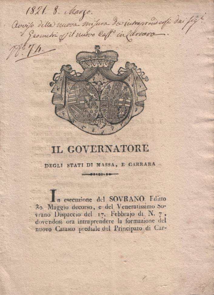 Notificazione relativa alle disposizioni per la formazione del nuovo catasto del Principato di Carrara, a firma del Governatore degli Stati di Massa e Carrara Petrozzani