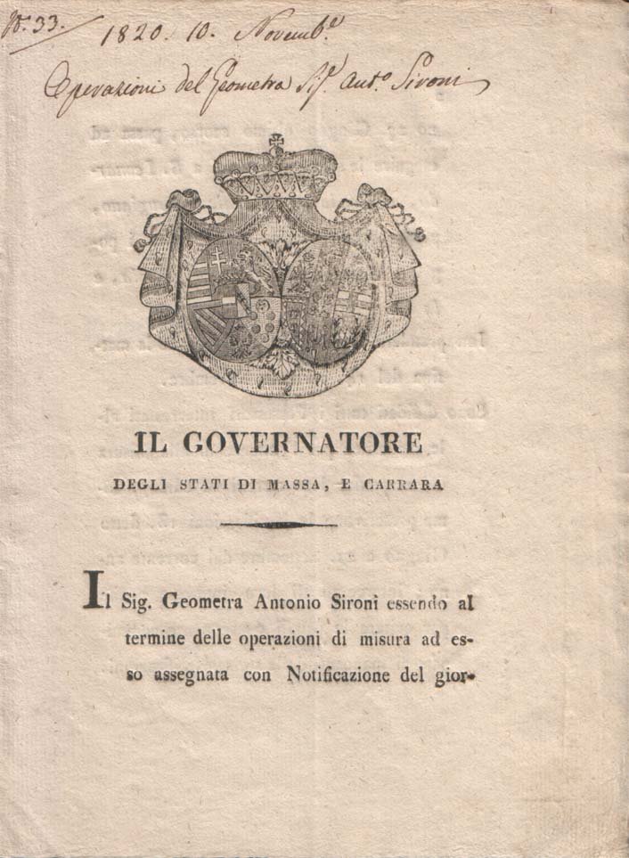 Notificazione relativa alle misurazioni per la formazione del catasto del Ducato di Massa da effettuarsi "a San Leonardo, al Bondano, e Canale di Brugiano, per proseguirle agli Oliveti sopra i poggi, a Castagnola, Crocello, Ortola e la Costa"