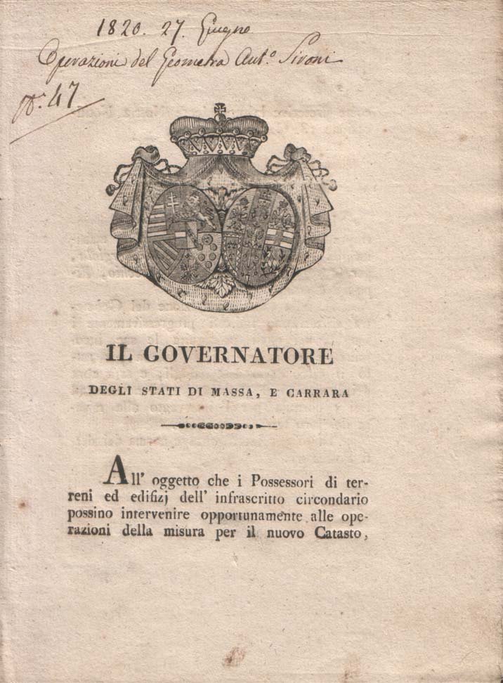 Notificazione relativa alle misurazioni per la formazione del catasto del Ducato di Massa riguardanti Bergiola, Bargana, Lavacchio, Ripa e Castagnetola