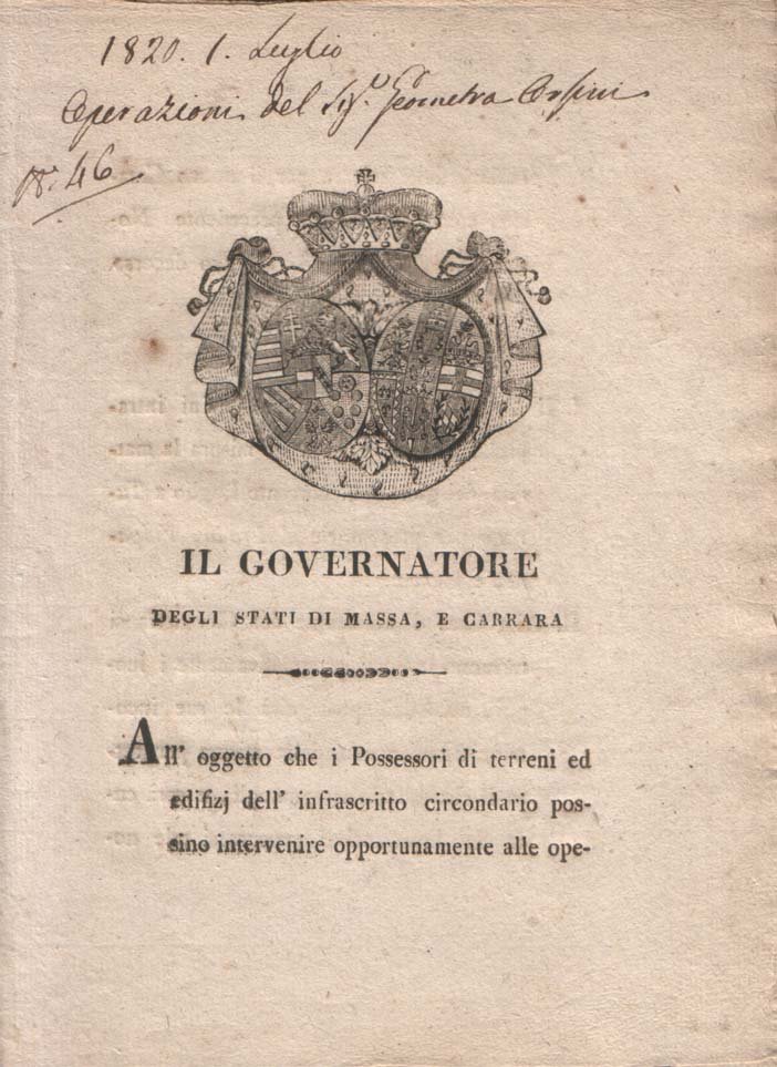 In-8° (24,5 x 18 cm), pp. 3, (1). Nota manoscritta coeva alla prima pagina, che riporta la data (1 luglio 1820) e i contenuti del documento; stemma xilografato a p. 1.