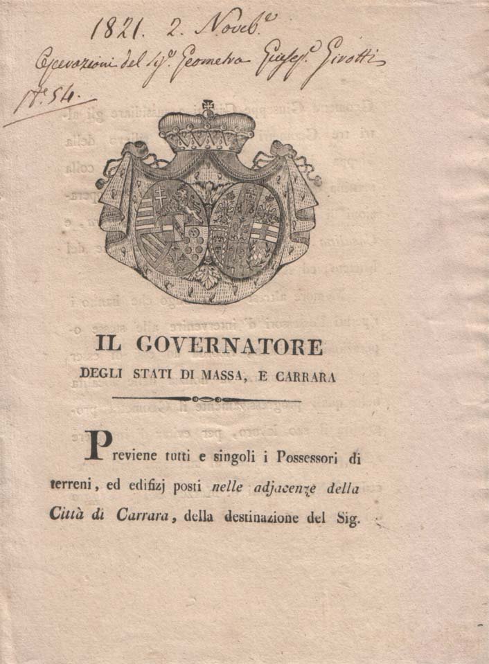 Notificazione relativa alle misurazioni per la formazione del catasto del Principato di Carrara da eseguirsi nelle adiacenze di Carrara cominciando "Dalle Vigne di Acquafiora, e Casalina" per proseguire "Sino al confine del Mirteto, ed Avenza"