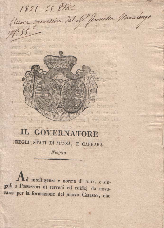 Notificazione relativa alle misurazioni per la formazione del catasto del Principato di Carrara da eseguirsi nelle adiacenze di Carrara principiando "dalle selve al di sopra del Muraglione" per proseguire "sino al confine di Codena, Miseglia e Torano
