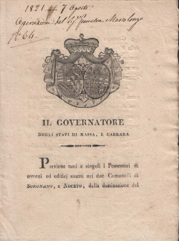 Notificazione relativa alle misurazioni per la formazione del catasto del Principato di Carrara riguardanti i "Comunelli" di Sorgnano e di Noceto