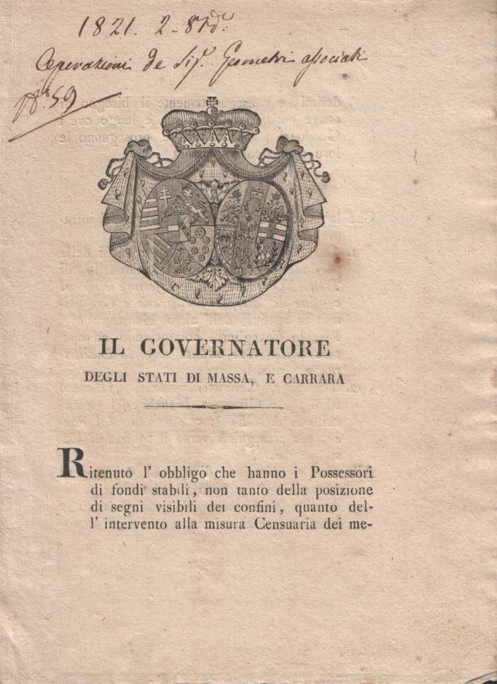 Notificazione relativa alle misurazioni per la formazione del catasto del Principato di Carrara riguardanti "il territorio del Comunello di Torano nella valle inferiore sino al confine di Miseglia, Carrara e Gragnana" e Noceto