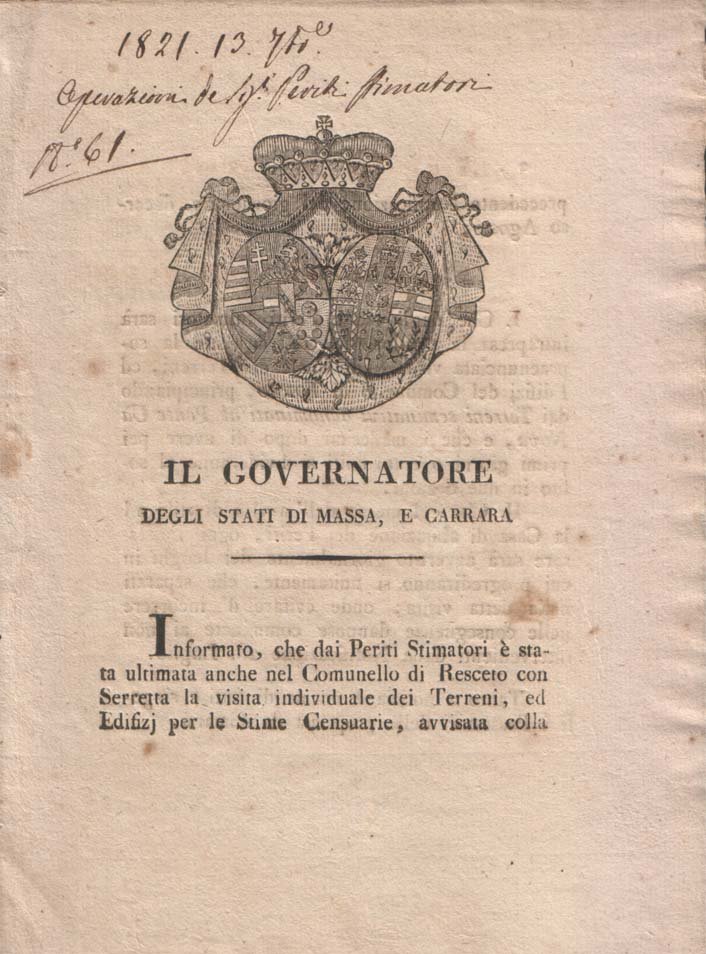In-8° (24,5 x 18 cm), pp. 3, (1). Nota manoscritta coeva alla prima pagina, che riporta la data (13 settembre 1821) e i contenuti del documento; stemma xilografato a p. 1.