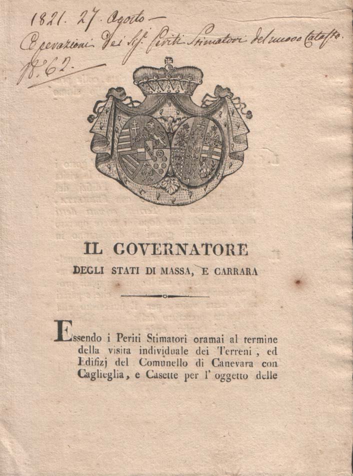In-8° (24,5 x 18 cm), pp. 3, (1). Nota manoscritta coeva alla prima pagina, che riporta la data (27 agosto 1821) e i contenuti del documento; stemma xilografato a p. 1.