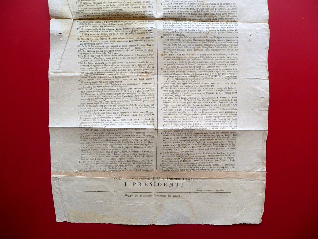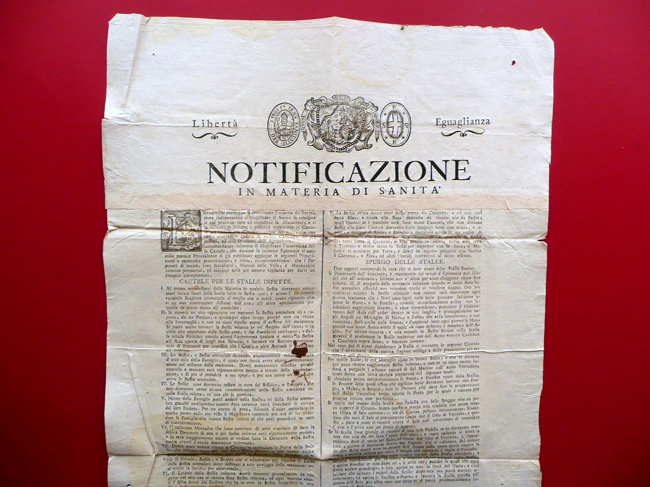 Notificazione, Notificazione in materia di sanità Estendendosi purtroppo la dominante epidemia dei bovini, trova indispensabile il Magistrato di Sanità di rivolgere le sue provvide cure ad impedirne la dilatazione, e si fa sollecito di dedurre a pubblica cognizione le cautele per impedire la communicazione del male [.] Cautele per le stalle infette [.]" Per il Davolio Stampatore in Senato, Reggio Emilia 1796; cm 81,5x42; testo su due colonne, con capolettera xilografico; margini alla forma; bel fregio inciso alla parte sup., raffigurante il patrono della città San Prospero e la Madonna. Al retro antica nota notarile. A causa delle ampie dimensioni la sentenza è costituita da tre fogli applicati. Condizioni di conservazione Esemplare ben conservato con tracce di pieghe di conservazione, alcune piccole lievi bruniture; parte centrale con leggerissima ombra di gora che non compromette in alcun modo la lettura del testo; poche piccole macchiette e una minuscola mancanza provocate da eccesso di inchiostro (vedi foto); margini esterni e angoli superiori con minuscoli forellini per probabile precedente affissione. Grida molto interessante e di argomento raro, ricca di precetti e norme atte a contrastare l'epidemia bovina. La lunga serie di norme è divisa in tre sezioni: "cautele per le stalle infette"; "metodo per sotterrare le bestie"; "spurgo delle stalle". Alla parte superiore bel fregio inciso raffigurante San Prospero patrono di Reggio Emilia e la Madonna. SC03.D16029 N "
