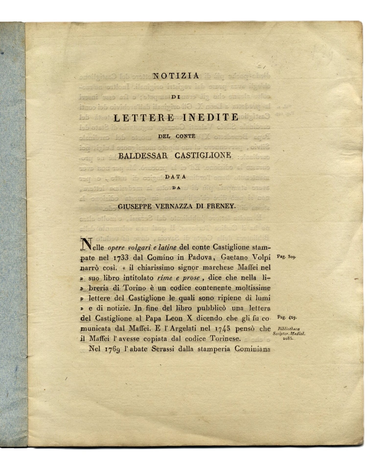 >in-4, pp. 19, (1), brossura muta coeva. Prima ed unica edizione in estratto, stampata separatamente dal tipografo Galletti lo stesso anno in cui uscì nelle "Memoires de l'Académie Impériale des Sciences de Turin" ( XXI - 1813: pp. 438-455. Giuseppe Vernazza di Freney riporta 4 lettere inedite del Castiglione, tratte dal codice J.b.IX.5. dell'Archivio di Stato di Torino, citato per la prima volta da Scipione Maffei in una corrispondenza ad Apostolo Zeno del 26 maggio 1711. Vernazza racconta nell'esaustiva premessa le vicissitudini del codice, preparato 50 anni dopo la morte di Castiglione per essere dato alle stampe ma mai licenziato, e sceglie tra le molte lettere ancora inedite: una della prima legazione Romana (16 gennaio 1522) indirizzata al Signor Duca di Urbino, una della seconda indirizzata al signor Marchese Federico di Mantova (10 decembre 1523), e due scritte durante il viaggio per andare da Carlo V ed indirizzate a Giammateo Giberti, datario di Clemente VII e poi vescovo di Verona (Nella Certosa di Verona, alli 26 di decembre 1524 - Da Susa il primo del 1525). Vernazza chiude la sua memoria augurando alle missive "per amore delle cose italiane" il plauso dei dotti a conferma del celebre elogio espresso dal Ginguené: "Elles sont précieuses pour l'histoire politique et littéraire". Ottimo esemplare, a grandi margini, di estratto davvero raro.