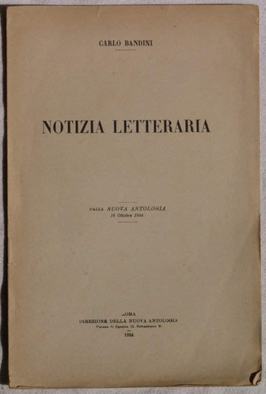 In 8. Dim. 25x16,5 cm. Pp. 6. nteressante pubblicazione letteraria del 1924 di Carlo Bandini. Estratto dalla Nuova Antologia del 16 Ottobre 1924. Bandini parla degli autori letterari in voga al tempo come Deledda, D'Annunzio, Verga ecc. In buone condizioni. Brossura editoriale in buone condizioni generali con lievi usure ai margini e dorso. rare fioriture. litterary pamphlet of 1924 by Carlo Bandini. Extract from Nuova Antologia of the 16th of october 1924. Bandini talks about the litterary author in fashion in that time as Deledda, D'Annunzio, Verga ecc. In good conditions. Editorial cover in good general conditions slightly worn in the edges and spine. Occasional foxings.