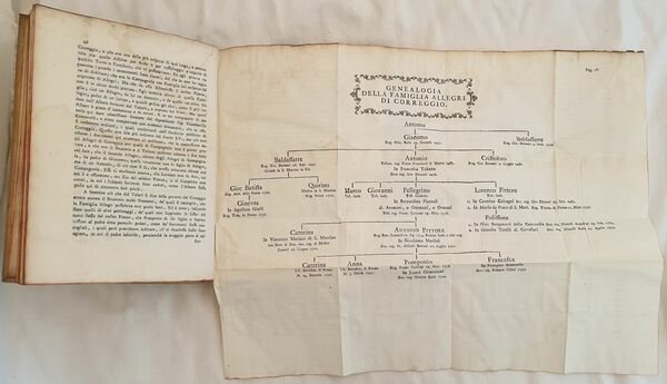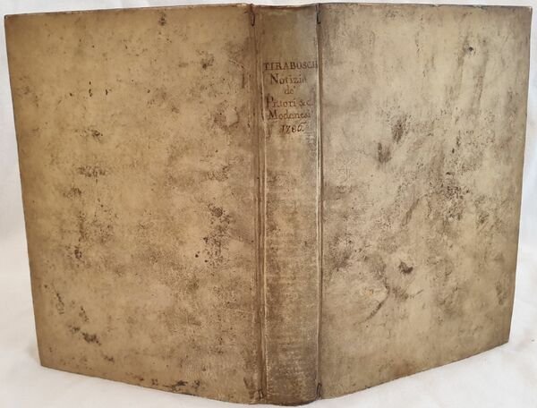Edizione del 1786 di questo interessante dizionario artistico dell'erudito e storico della letteratura italiana Girolamo Tiraboschi (1731-1794). All'interno biografie di tutti i pittori, scultori, incisori e architetti degli stati Estensi. Appendice dei professori di musica. Tabella ripiegata "Genealogia della famiglia Allegri di Correggio". "il primo copioso dizionario di artisti dello stato estense, dovuto nientemeno che al celebre storiografo della letteratura italiana" Schlosser pp. 459, 499. Tagli rossi. In discrete condizioni. Coperta in piena pergamena coeva con titolo manoscritto al dorso in buone condizioni generali con lievi usure ai margini e dorso. Legatura in buone condizioni. Pagine in discrete condizioni con fioriture e lievi gore d'umidità. In 8. 245 x 180 mm. Pp. 399. Peso Kg. 0,858 Editrrion of 1786 of this interestinf artistic dictionary by the scholar and historian of italia literature Girolamo Tiraboschi (1731-1794). Inside biographies of all painters, sculptors, engravers and architects of State Estensi. Appendix of teachers of music. Folded chart "Genealogy of Family Allegri from Correggio". "il primo copioso dizionario di artisti dello stato estense, dovuto nientemeno che al celebre storiografo della letteratura italiana" Schlosser pp. 459, 499. Red extremities. In fair conditions. Parchment coeval cover with handwritten title in the spine lightly worn in the extremities. Bindign in good conditions. Pages in fair conditions with occasional foxings and light dump stains. In 8. 245 x 180 mm. Pp. 399. Weight Kg. 0,858