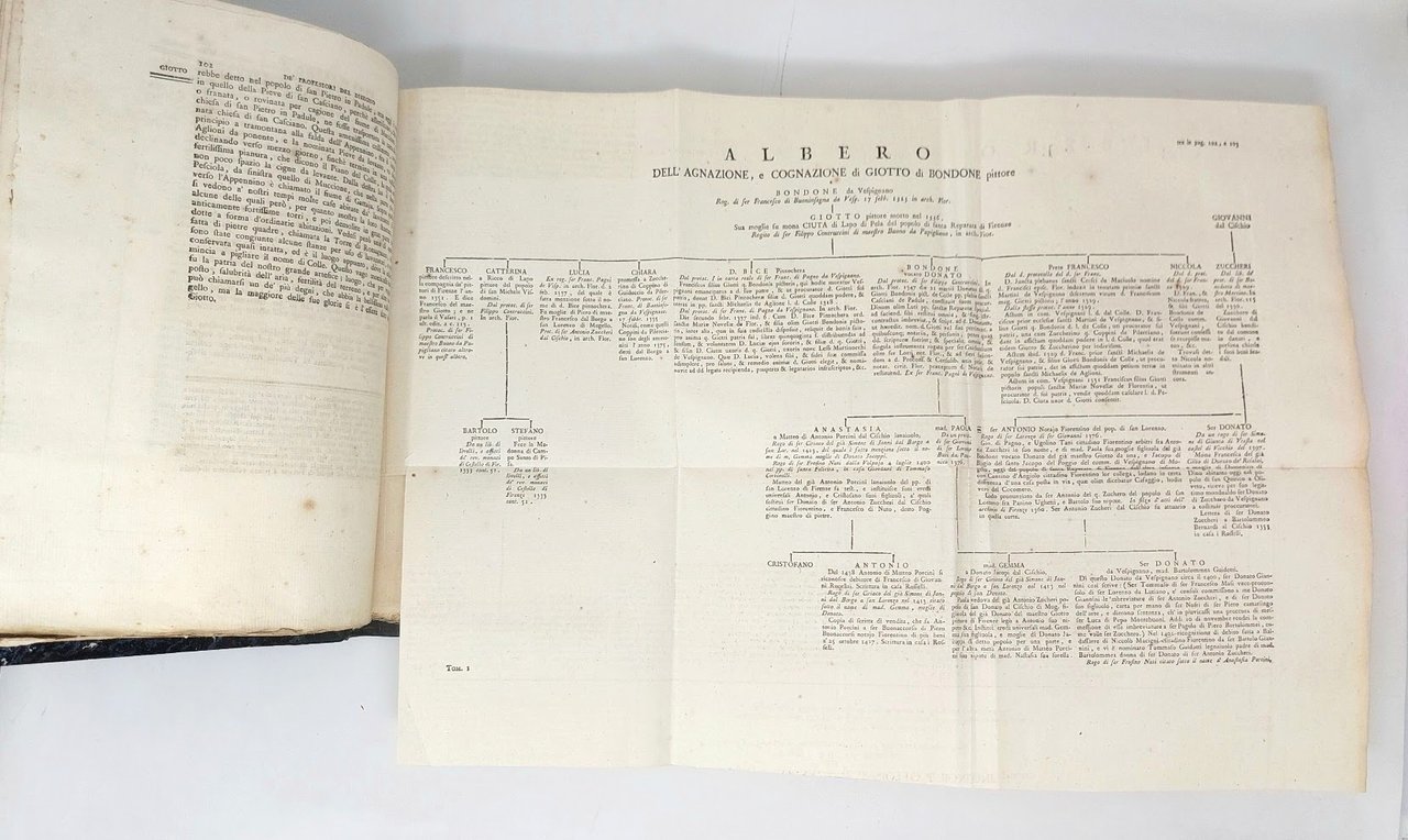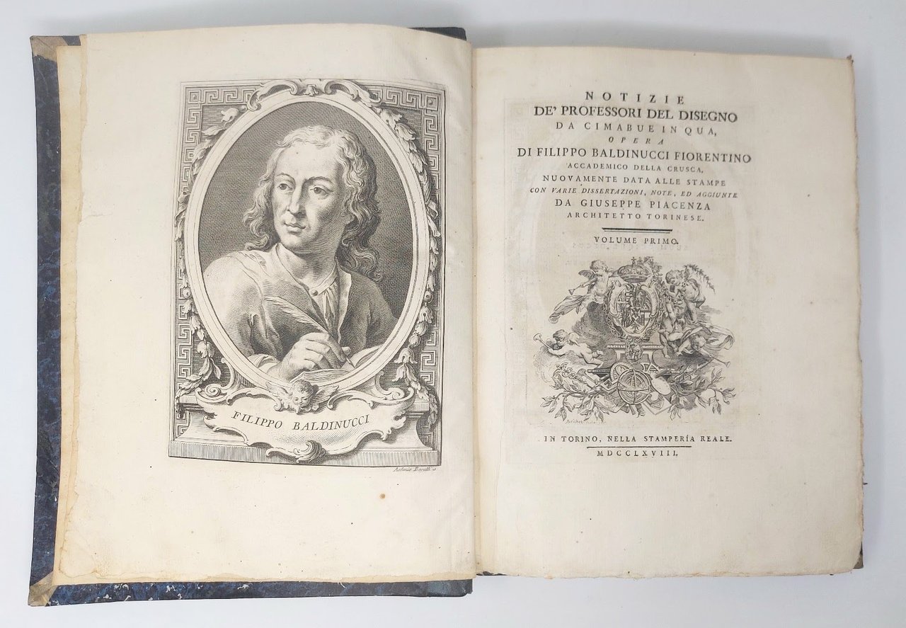>6 volumi in-4 (mm 275x221), pp. XVI-588, XX-532, XLVIII-470, XII-476, XI, (1)-466 (dopo p. 280 ripetute le pp. 193-280), XI, (1)-472. Bella legatura del tempo mezza pelle bleu, titolo e fregi oro ai dorsi. I sei volumi hanno in antiporta un ritratto a mezzo busto di celebri artisti, inciso in rame: Baldinucci, Brunelleschi, Michelangelo, Giulio Romano, Vasari e Sansovino. Terza edizione, non comune, di questa fondamentale opera di storia dell'arte, una continuazione delle Vite del Vasari: "E' espressa intenzione del Baldinucci rinnovare e continuare il Vasari su un'ampia base moderna. E' questa in realtà la prima storia universale dell'arte figurativa in Europa, scritta in uno stile impeccabile, si da essere compresa fra i testi di lingua della Crusca" (Schlosser-Magnino). I sei volumi offrono accurate vaste notizie biografiche e artistiche di centinaia di pittori italiani, e alcuni stranieri, dal XIV al XVI secolo, accompagnate da copiosi indici. Edizione assai aumentata rispetto alle due precedenti, dedicata dall'autore al Duca Cosimo III. Esemplare di grande bellezza, a pieni margini, in barbe ( quache lieve fioritura). Cicognara n.2199. Gamba, Testi di lingua, 1760. Schlosser-Magnino, pp.473 e 466.