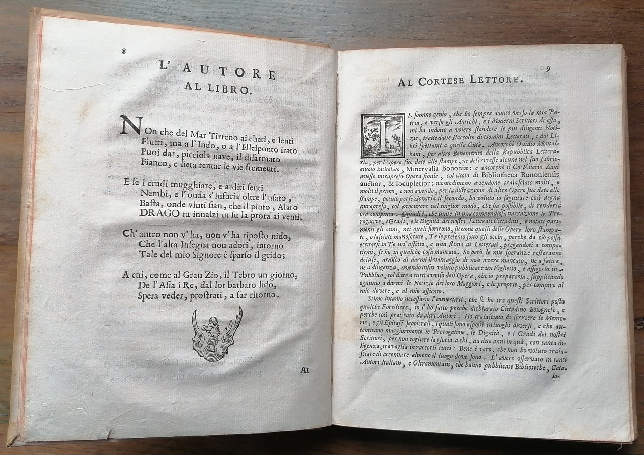 In 4° antico (cm 23,5 x 17,5), legatura rigida coeva in piena pergamena, titolo manoscritto al dorso, tagli colorati in rosso, pp. 356, motto al frontespizio ed alla fine del volume, testatine, capolettera ornati e finalini in xilografia. Prima edizione. Ottimo stato di conservazione.