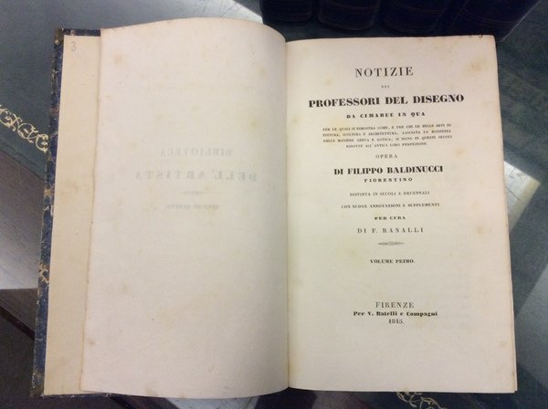 In-8 p. (mm. 220x135), 5 volumi, mezza pelle coeva, filetti e titolo oro al dorso, pp. 607; 666; 758; 715; 720. Nell'opera si dimostra come, e per chi le belle arti di pittura, scultura e architettura, lasciata la rozzezza delle maniere greca e gotica, si siano in questi secoli ridotte all'antica loro perfezione. Questa edizione porta in Appendice la ristampa della Vita del Bernini (che l'A. scrisse per commissione di Cristina regina di Svezia).Così Schlosser Magnino, p. 466: E' questa in realtà la prima storia universale dell'arte figurativa in Europa, scritta in uno stile impeccabile, sì da esser compresa fra i testi di lingua della Crusca.. Si comincia con l'avo leggendario Cimabue (1260) fino ad arrivare a Fra Mattio Preti, detto il Pittor Calabrese (1670).. Baldinucci ha riunito documenti e altri manoscritti in quantità rilevante, e anche se la sua critica è talvolta discutibile, con questo uso di relazioni autentiche egli si avvicina al tipo del moderno storico dell'arte.Cfr. CLIO VII,5348 - Gamba,1759 cita le varie ediz. a partire dalla prima in 6 volumi del 1681-1728.Qualche lieve fiorit., ma complessivam. esemplare ben conservato.<br> "Il fiorentino Filippo Baldinucci (1624-96), letterato e scrittore di arte, fu consulente del Card. Leopoldo de' Medici e ne ordinò la collezione di disegni, ora agli Uffizi. Scrisse una serie di biografie di artisti, compilò il Vocabolario Toscano dell'Arte del Disegno (1681) e a lui dobbiamo la migliore e più accurata biografia del Bernini. Fu anche incisore e collezionista di disegni (ora al Louvre)". Cfr. Diz. Treccani,II, p. 35.