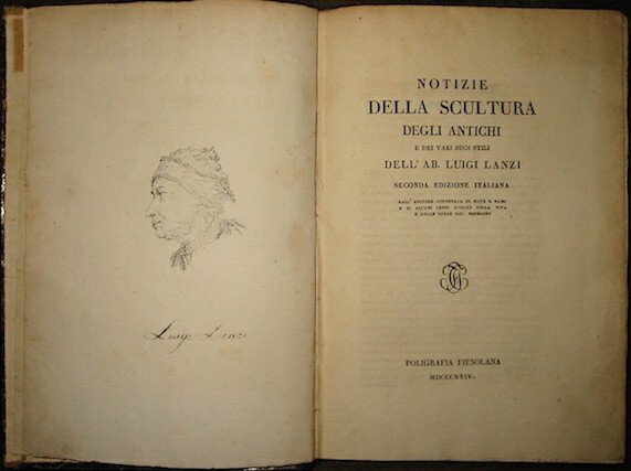 8vo (cm. 21,5), XXXI-83(1) pp. Ritratto dell’A. in antiporta e 19 tavv. f.t. in fine (raffiguranti monete, urne, bassorilievi, statue egizie, greche, etrusche e romane). Legatura coeva in mz. pelle con fregi e titolo impresso in oro al ds. (lievi tracce d’usura alle cuffie e agli angoli). Minime, sporadiche fioriture altrimenti esemplare in ottimo stato di conservazione. Studio assai apprezzato per la comprensione e la datazione dei diversi stili antichi. Cicognara, 2595; Gresse IV, 102