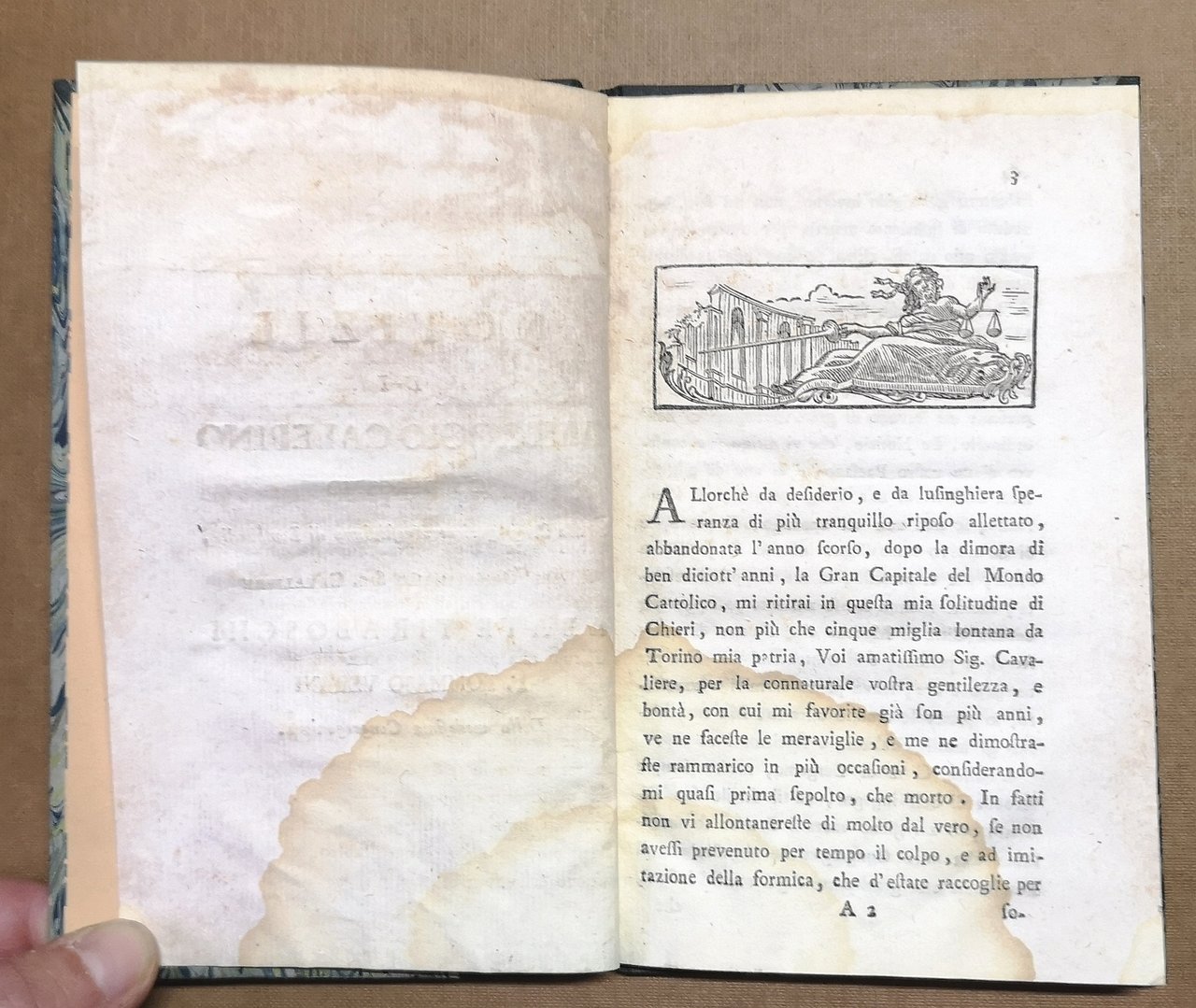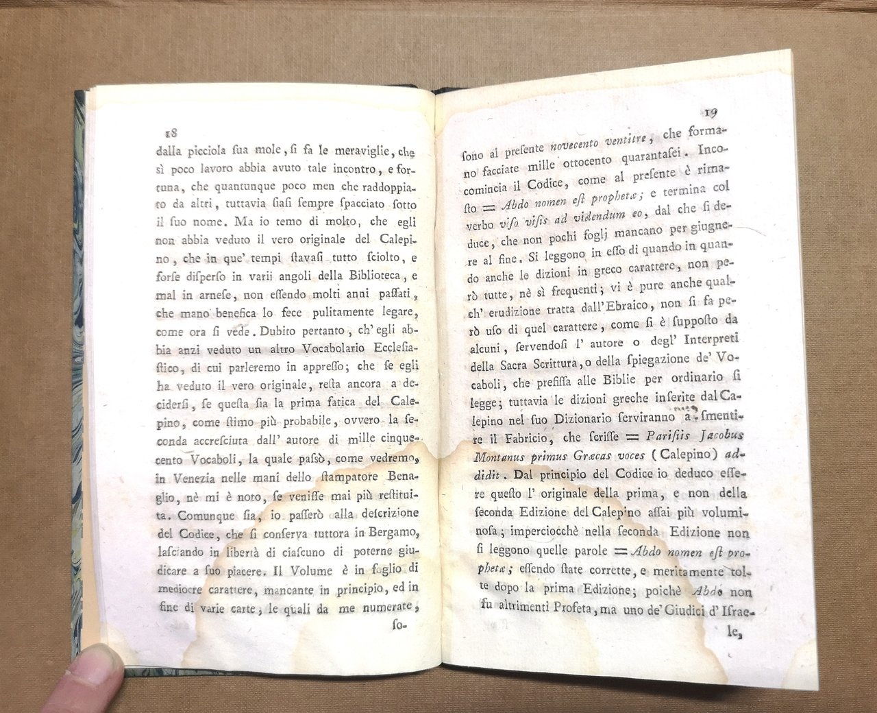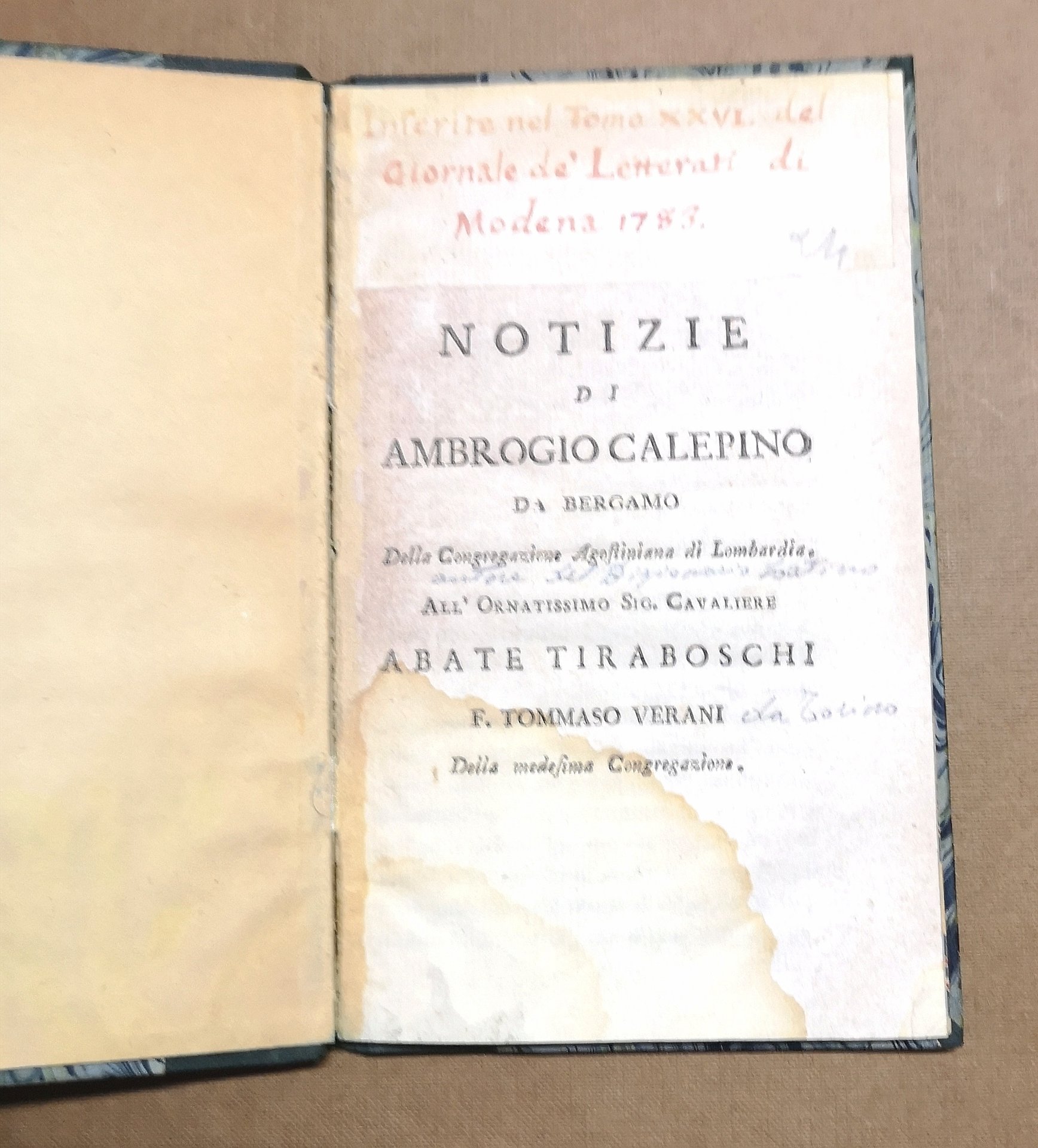 >in-12, pp. 47, leg. in m. tela verde. Edizione originale, rarissima forse ad uso dell'A.; al frontespizio nota applicata, ms. di mano coeva, che recita: ''Inserire nel Tomo XXVI del Giornale de' Letterati di Modena 1783. L'A.(1435-1511) della Congregazione Agostiniana in Torino che, oltre alla presente dedicata all'autore del celebre dizionario latino ''Calepinus (Dictionum Interpretamenta, 1502)'', scrisse almeno altre due opere storiche legate a personalità del proprio ordine, di cui una senza luogo né data e una impressa a Modena nel 1790. Raro. (Esemplare con lieve alone d'umido al margine interno dei fogli).