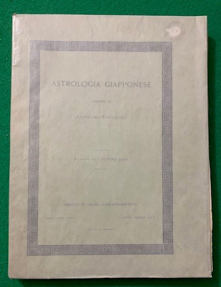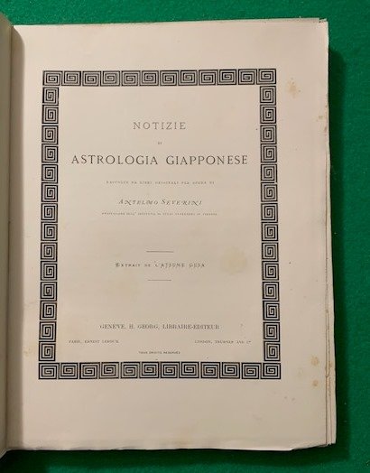 In 4°; (6), 168, IV pp. e 4 c. di tav. delle quali tre più volte ripiegate. Brossura editoriale con titolo entro cornice al piatto anteriore. Esemplare ancora a fogli chiusi. Prima edizione di questa monografia dedicata all'astrologia giapponese scritta dal noto orientalista, docente di lingue dell'Estremo Oriente nell'Istituto di studi superiori di Firenze, traduttore anconetano, Antelmo Severini (nato ad Arcevia (AN) 1828, morto a Pausula in provincia di Macerata, 1909) . Esemplare in ottime condizioi di conservazione. Le 4 tavole contengono: La Tetrasinossi divinatoria del Gran Maestro Koo-Boo, l'Arcolajo dei giorni di tutto l'anno, il Prospetto delle 24 Mansioni o Rosa dei Venti, Il Prospetto di esatta corrispondenza delle due Rose dei Venti (la giapponese e l'europea). Altre illustrazioni e ideogrammi giapponesi sono presenti nel testo con loro traduzione e spiegazione. Raro. Rif. Bibl.: IT\ICCU\UMC\0876098; Manca al Caillet e al Dorbon.