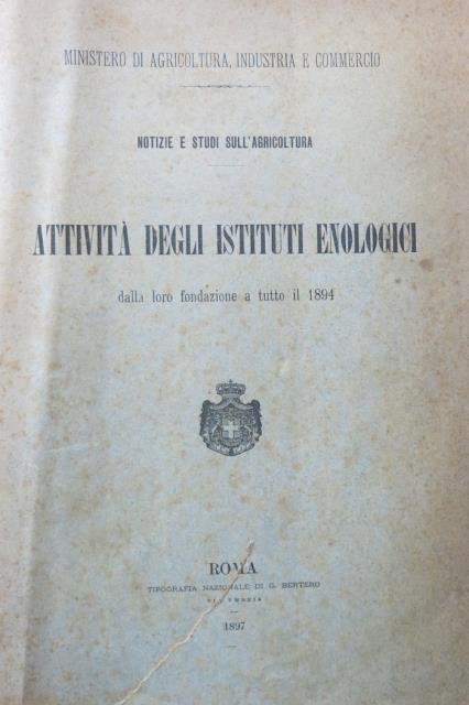 Roma, Tipografia Nazionale di G. Berteo, 1897. In 4to, pp. VIII, 451 con Indice + tabelle rip., bross. edit. in carta verdina con titoli in nero. Testo corredato da numerosissime tabelle relative ai risultati delle attività degli studi enologici; compilazione statistica di grande interesse, che esamina ad esempio i problemi risolti, quelli irrisolti e quelli in via di soluzione in enologia, le analisi chimiche per ciascun anno. Ingiallimento della brossura e dei fogli.