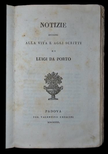 Due opere legati alla figura di Luigi da Porto rilegate in un unico volume rilegato in cartoncino coevo marmorizzato. In 8° (22x13 cm). Opere in buone-ottime condizioni di conservazione. Per la prima opera: 37, (3) pp. Una xilografia al frontespizio. Prima edizione di questa rara biografia del grande scrittore e storiografo piacentino, Luigi da Porto. Discendente di una nobile famiglia vicentina, molto presto venne educato alle armi e alle lettere presso un parente di Urbino. Ebbe una vita avventurosa di amori e spade, fino alla scaramuccia in Friuli con dei soldati tedeschi nel 1511 durante uno scontro vicino al fiume Natisone. Letterato fine e poco conosciuto scrisse delle Rime pubblicate nel 1539, e una settantina di Lettere storiche, pubblicate nel 1857, sugli avvenimenti politici e bellici seguiti alla lega di Cambrai. Di lui rimane mistero soprattutto per la Historia nuovamente ritrovata di due nobili amanti (Historia novellamente ritrovata di due nobili amanti, pubblicata nel 1530 circa e successivamente ristampata insieme alle Rime nel 1539, con la revisione linguistica di Pietro Bembo), novella che Luigi da Porto scrisse nella pace della sua villa di Montorso Vicentino, convalescente per le ferite dell'animo e del corpo. La storia racconta del tormentato amore di Romeus e Giulietta, da cui William Shakespeare trasse in seguito ispirazione per la sua più famosa tragedia, Romeo e Giulietta. L'ispirazione per la storia a sua volta deriva probabilmente da un racconto di Masuccio Salernitano, Mariotto e Ganozza, che Da Porto rielabora, modernizzandola e introducendovi numerosi elementi poi ripresi dal grande drammaturgo inglese. Già nell'esordio c'è l'intenzione dell'autore di inserire le vicende in una cornice verosimilmente storica: si tratta una pausa dei combattimenti in cui egli era impegnato, e una marcia di trasferimento da Gradisca a Udine, con l'introduzione di un narratore esterno, l'arciere Pellegrino un amico di ventura dello scrittore al quale è demandato il compito di consolare Luigi da una delusione d'amore, narrando una vicenda da cui si comprenda come «lo star molto nella prigion d'amore si disdica, sì tristi son quasi tutti è fini, a' quali egli ci conduce, ch'è uno pericolo il seguirlo». La prova è in un racconto assai diffuso nella sua città di origine, Verona, su due giovani amanti. Altre teorie più recenti e documentate danno invece al racconto un carattere più autobiografico, per cui dietro Romeo e Giulietta si celerebbero le figure di Luigi stesso e di sua cugina Lucina Savorgnan, implicati entrambi nelle vicende di faide tra Strumieri e Zamberlani che infiammavano il Friuli nel primo Cinquecento, culminando con la rivolta della Crudel Zobia Grassa. Ad avvalorare queste teorie ci sarebbero corrispondenze tra le cronache friulane e i particolari del racconto di Da Porto e alcuni dettagli che rispecchiano più la situazione urbanistica di Udine che non a quella di Verona. Per la seconda opera: 88 pp. Prima edizione di questa raccolta di lettere inedite di Luigi da Porto. Le lettere sono indirizzate al Conte Antonio Savorgnan a Udine per la maggior parte e alcune a Lodovico Almerico, Ghellino dei Ghellini, Pietro Bembo in Urbino, Faustino Broja in Sossano, Carlo Antonio Caccialupo a Bologna.