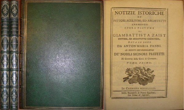 3 parti in 2 voll. in-4, pp. (20), (6); 174, (2), 106, magnifica pregiata leg. ottocentesca marocchino verde a grana larga con tit. oro e fregi al d. con nervi, dentelles, tagli dorati, risguardi in carta dec. La terza parte dell’opera ha front. autonomo e contiene 2 tavv. in rame con il ritr. del Campi inc. da G. Cavalli e la sezione del corpo umano. Cicognara 2409. Schlosser 533. Ediz. orig. Splendido esempl. [307]