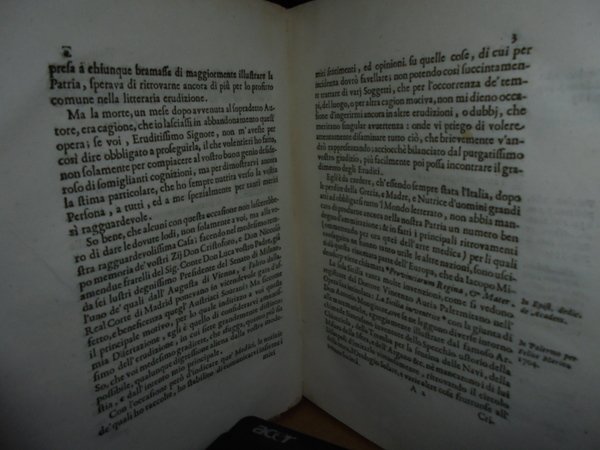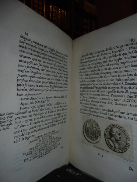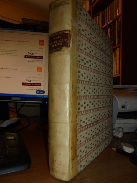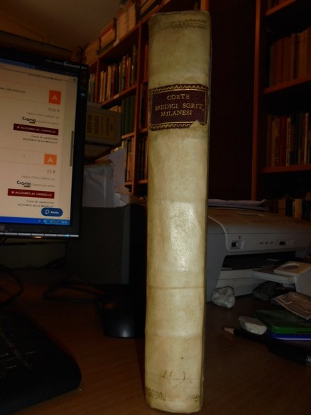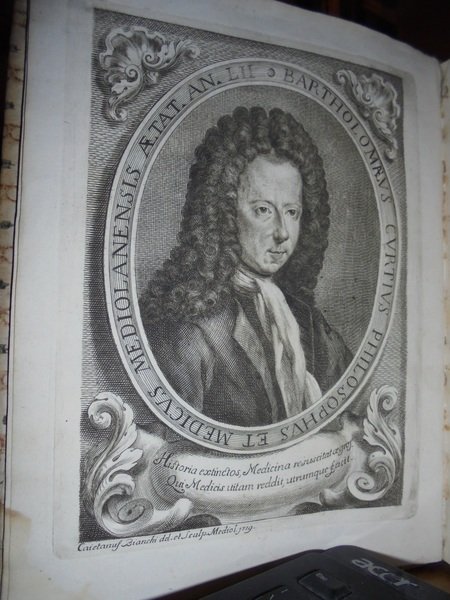 Corte, Bartolomeo. In Milano, nella Stampa di Giuseppe Pandolfo Malatesta, 1718. Notizie istoriche intorno A' Medici Scrittori Milanesi, e a principali ritrovamenti fatti in Medicina dagl' Italiani. Presentate all' Illustrissimo Sig. Conte D. Carlo Pertusati. Edizione originale. In-8 gr. (mm. 275 x 225), m-pergamena coeva, fregi e titolo in oro entro tassello al dorso, (vi) 312 pp., piccola vignetta allegorica al frontesp. inc. in rame; ritratto dell’A. in medaglione, disegnato e inc. in rame da Gaetano Bianchi; vignetta inc. nel t. con la medaglia coniata in occasione dell’entrata in Milano di Francesco Sforza; testo ornato da capilettera e finalini silografati. Bell' esemplare dell' unica rara edizione. Cas.