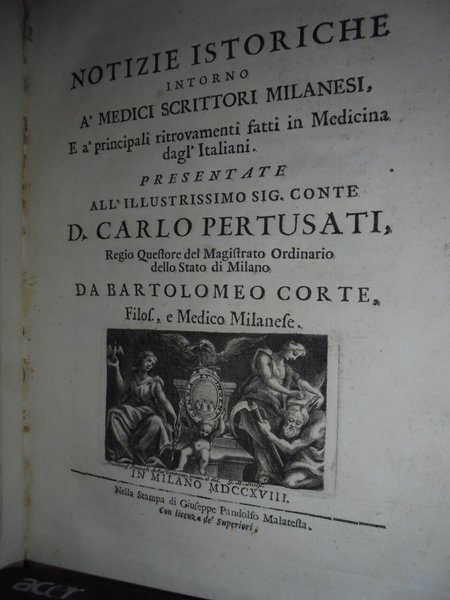 Notizie istoriche intorno A' Medici Scrittori Milanesi, e a principali ritrovamenti fatti in Medicina dagl' Italiani. Presentate all' Illustrissimo Sig. Conte D. Carlo Pertusati.