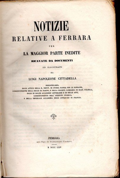 NOTIZIE RELATIVE A FERRARA per la maggior parte inedite ricavate da documenti ed illustrate da.