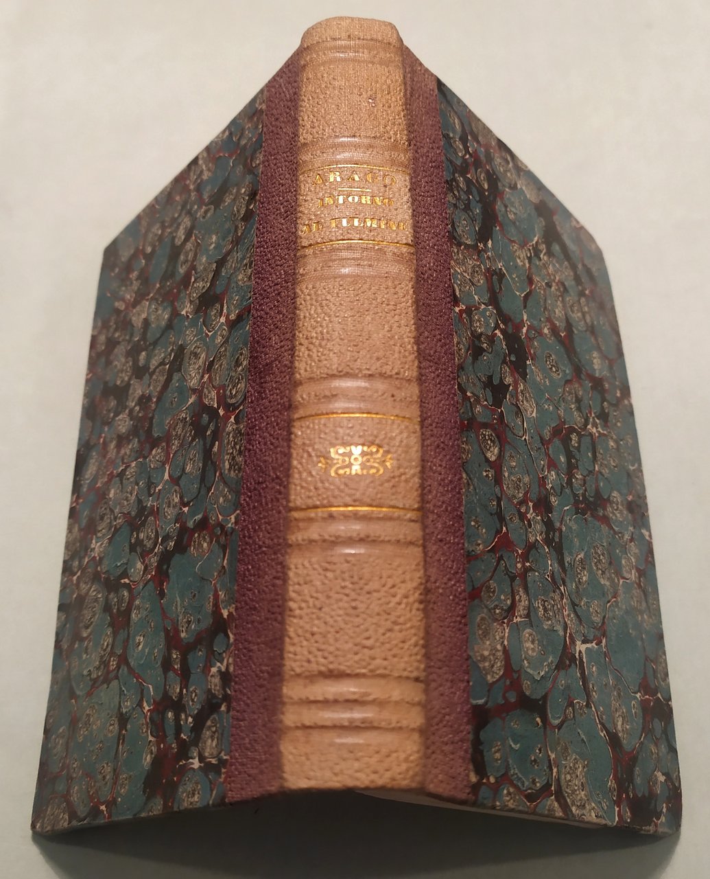 ARAGO François Jean Dominique. Notizie scientifiche intorno al fulmine tradotte dal francese da Giuseppe De Luca. Napoli, dalla Stamperia della Società Filomatica, 1846. In 16mo; pp.IX,1n.n. con errata, 1 carta bianca e pp.359. Mezza tela coeva, titolo e fregi in oro al dorso. Wikipedia: "François Jean Dominique Arago (1786 – 1853), matematico, fisico, astronomo e uomo politico francese. Fu nominato dall'imperatore astronomo dell'Osservatorio nazionale francese, si interessò allo studio della pressione e alla velocità del suono. Studiò il magnetismo e di come molti corpi potessero essere magnetizzati, ricerche che in seguito furono portate avanti da Michael Faraday. Collaborò con Augustin-Jean Fresnel aiutandolo a confermare le sue teorie sull'ottica. Nel 1830 venne eletto alla camera dei deputati del distretto dei Pirenei orientali. Come deputato propose un contributo economico per l'invenzione di Louis Daguerre, la dagherrotipia. Fu il Primo Ministro della Francia dal 9 maggio al 24 giugno 1848".
