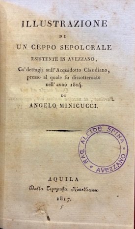 16mo (cm. 18), 112 pp. (unito) Minicucci Angelo, Illustrazione di un ceppo sepolcrale esistente in Avezzano co’ dettagli sull’Acquidotto Claudiano, presso al quale fu dissotterrato nell’anno 1804, Ibidem, 1817, 68 pp., 1 c.nn. Con una tavola ripiegata in fine. Legatura ‘900 in mz. tela. Nella prima opera forellini al frontespizio e alcune piccole macchie sparse. Nella seconda opera, percorsi di tarlo con perdita di alcune lettere di testo. Provenienza: Collezione Spina, Avezzano (timbretti ex libris). Per la prima opera cfr. Minieri Riccio (n. 289): ‘è questo un lavoro bene condotto e molto interessante’; Bindi, p. 219. Non in Pansa né in Zuccarini. Per la seconda opera cfr. Minieri Riccio, n. 706; Bindi, p. 231; Zuccarini, n. 3915. Non in Pansa.