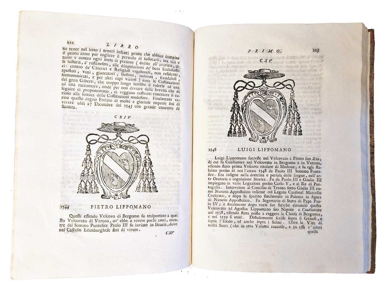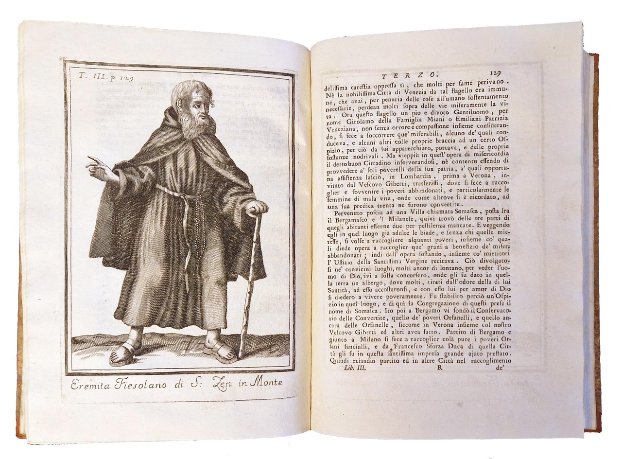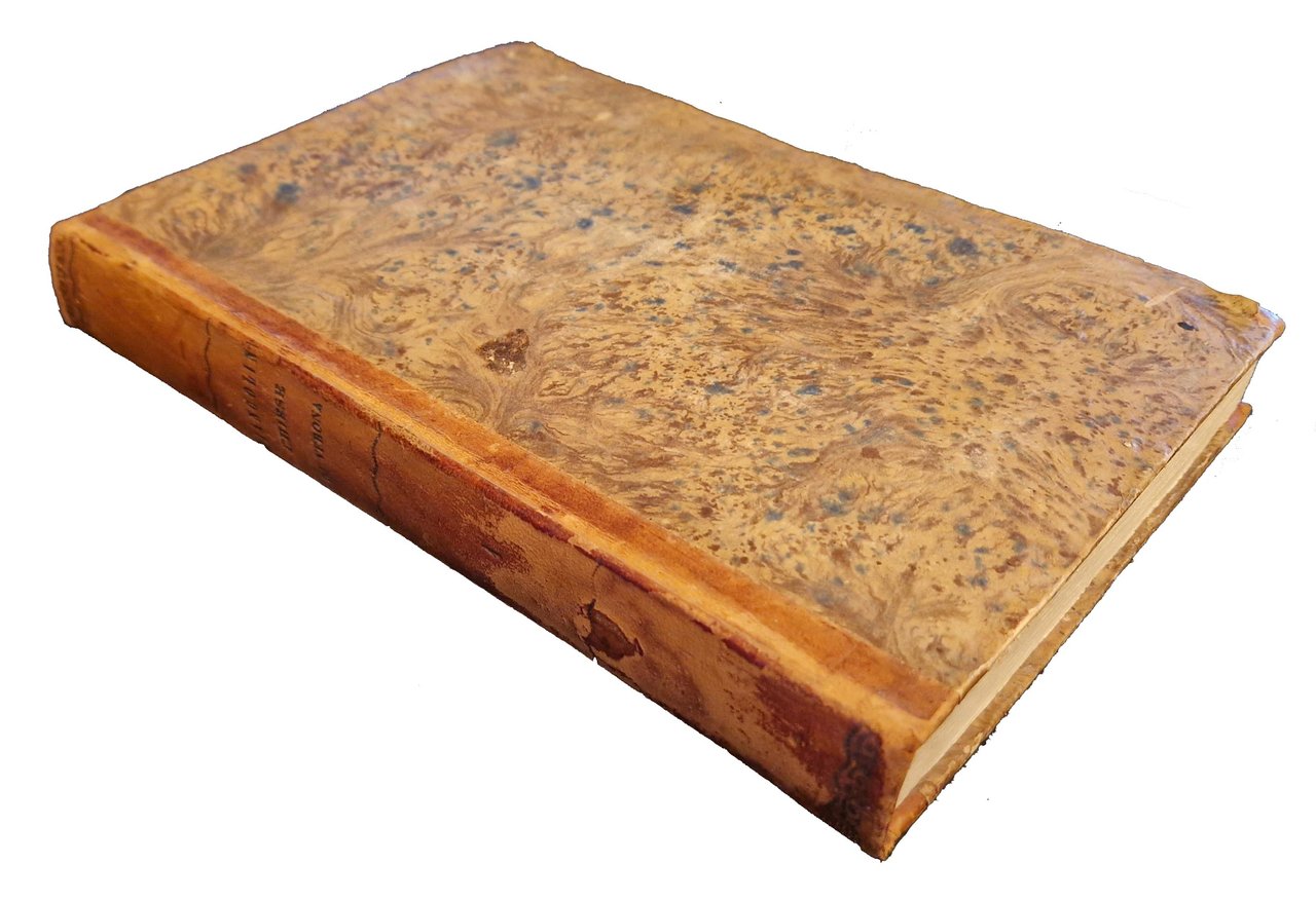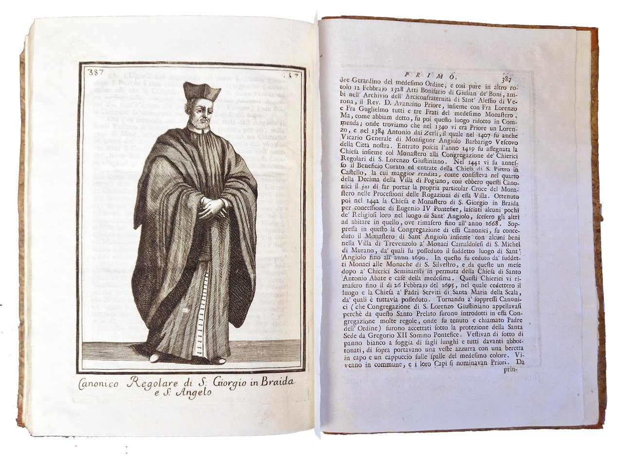 in-4°, 238x170 mm, leg. in mezza pelle e carta marmorizzata ai piatti, decori e titoli impressi in nero ai dorsi; opera in 4 volumi; pp. [8], 388, [4], [2] carte di tav.; pp. [6], carte 395-396, pp. 397-838, [2], [4] carte di tav.; pp. 325, [3], [6] carte di tav.; pp. [2], 331-850 [i.e. 856]. Bellissime testatine, finalini e iniziali xilografate (molti sono gli stemmi, anche religiosi). Le tavole calcografiche sono incise da Giovanni Urbani. Nel primo volume ci sono: la dedica a Giovanni Bragadin; una illustrazione sottoscritta Cristofali del. Vrbani sculp. a carta E1v p. 34); una tavola calcografica a piena pagina a carta D4v (p. 32); una tavola calcografica fuori testo dopo la p. 386. Nel secondo volume ci sono tre tavole calcografiche; nel terzo ce ne sono sei. Il terzo volume è stato pubblicato nel 1750, mentre il quarto nel 1752. Prima edizione di questa raccolta di notizie storico-artistiche sulle antiche chiese e conventi, veronesi e del territorio. molti ormai scomparsi, a cura di Giovanni Battista Giuseppe Biancolini (1697-1780). L'opera fu successivamente integrata nel periodo dal 1752 al 1771 con altri 5 volumi (dal quinto all'ottavo, con il quinto volume suddiviso a sua volta in due). Rif.: IT\ICCU\PUVE\008078 [IT\ICCU\PUVE\008112; IT\ICCU\PUVE\008113; IT\ICCU\PUVE\008114; IT\ICCU\PUVE\008115]. OCLC, 759539026. Cond.: Tracce d'uso alla legatura (abrasioni alla pelle dei dorsi). Carte pulite. Esemplare molto buono.