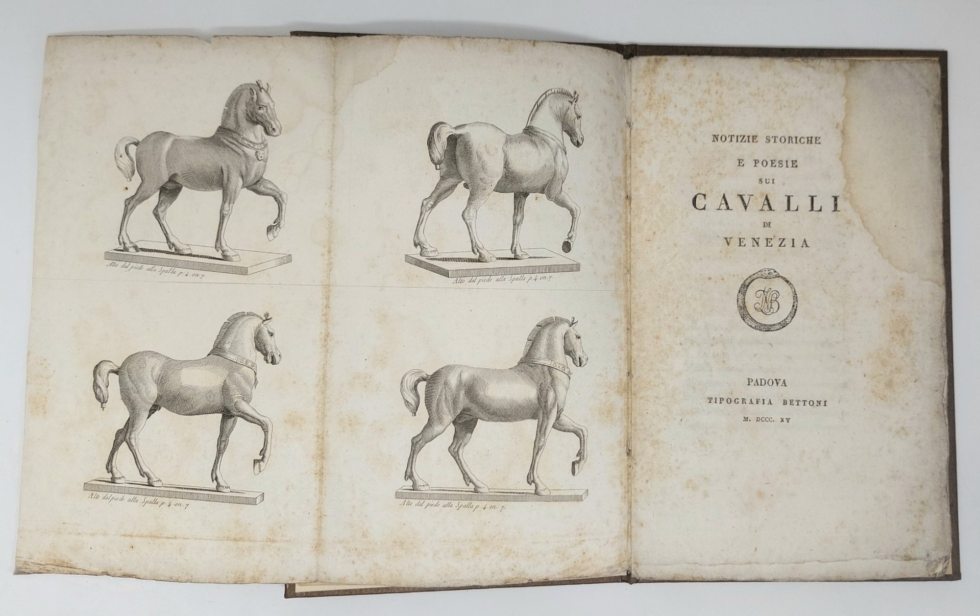 >in-8, pp. 24, leg. mod. cart. Con una tav. inc. in rame ripieg. f.t. raffig. 4 cavalli. Nella dedica a Bartolomeo I. Gradenigo, podestà di Venezia, il Bettoni si dichiara autore di queste "storiche notizie sui veneti cavalli"; le poesie d'argomento ippico sono di Paolo Pola (un sonetto) e di Girolamo Perucchini (un'ode). Esemplare a grandi margini (con una lieve macchia d'umido).
