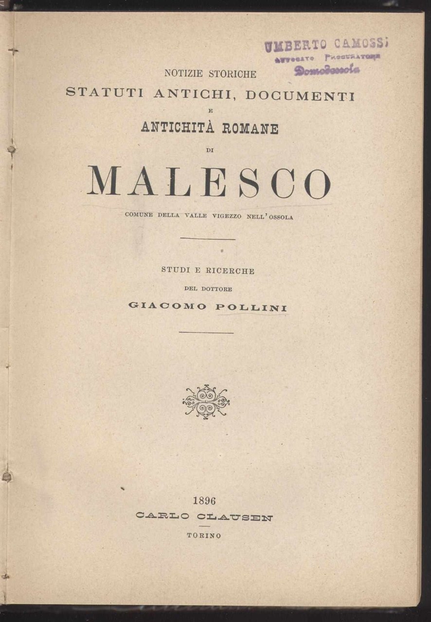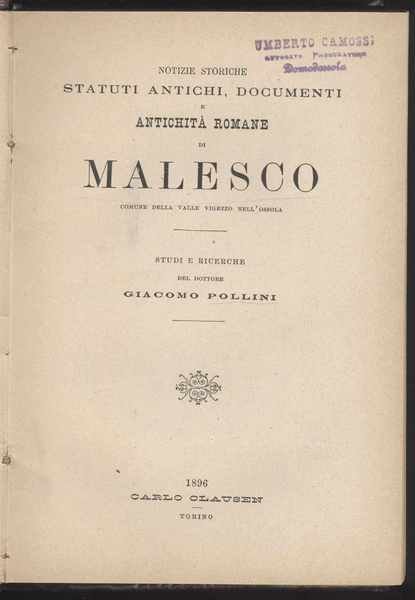 Notizie storiche, statuti antichi, documenti e antichità romane di Malesco, comune della Valle Vigezzo nellOssola. Studi e ricerche. - Torino, Clausen, 1896