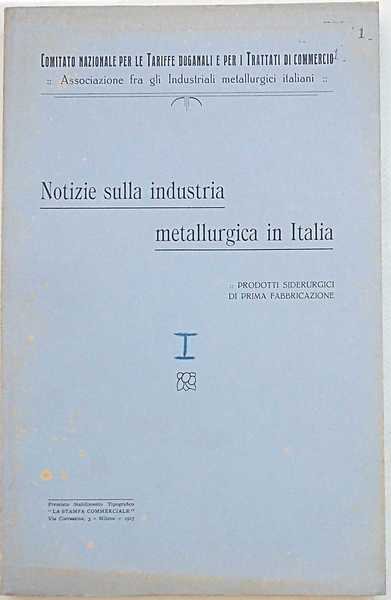 In 4° (cm. 28,5 x 18); pagg. 198; leggera cartonatura originale. VG-. ** Pubblicato dal Comitato n.le per le Tariffe Doganali e per i Trattati di Commercio con la Associzione fra gli Industriali metallurgici italiani. Contiene ampi cenni storici, materie prime, prodotti greggi, prodotti finiti (laminati, tubi, trafilati).