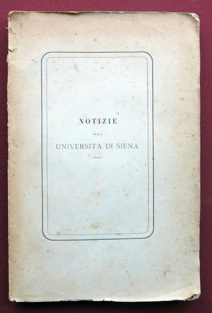 Tipografia Sordo - Muti di L. Lazzeri, Siena, 1873. In 8vo, occhietto (al verso dell'occhietto si legge: "Queste notizie furono redatte in replica alla Circolare del Ministero della Istruzione Pubblica del dì 11 Luglio 1872), pp.148 (con Indice), bross. orig.in carta. Vasta e riguardevole compilazione che contiene i cenni storici sulla Università di Siena, suddivisi nelle fasi di progresso, splendore e decadenza, con ampia Bibliografia e Appendice e con Elenco dei Professori e degli Istituti Scientifici Universitari. Esemplare con difetti della brossura, ingiallita ai bordi e con mancanze al dorso, di conseguenza allentato ma buono tutto l'interno. .