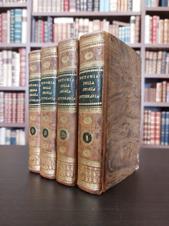 <span style="font-style: normal;">4 volumi in-8° (cm. 16,2), belle legature coeve in mezza pelle con titolo in oro su tassello verde e fregi in oro al dorso (lievi tracce d'uso e piccoli fori di tarlo), tagli spruzzati in rosso e blu; carte in stato molto buono (lievissime e sporadiche fioriture). Stemmi silografici ai frontespizi di ogni volume. Eleganti testatine, capilettera e finalini figurati. Testo a sé stante ma di commento alla monumentale opera di Zaccaria F. A. e Gabardi G.,</span><i> Storia Letteraria d'Italia</i>, 14 voll., Venezia, 1750-1759. Cfr. Melzi II, 246. Edizione non comune. Esemplare molto buono. (SL4)