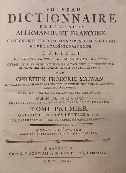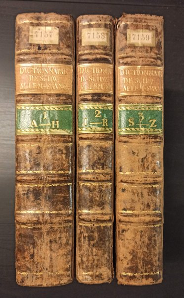 Copertina Rigida con legatura in mezza pelle.<BR>Condizioni Molto buone<BR>Nuovo dizionario francese-tedesco. Tedesco-Francois. Volo. I-III. Contenenti tutte le parole usate, il loro genere e la loro definizione, con i diversi significati in cui sono impiegate letteralmente e figurativamente, i termini propri delle scienze e delle arti, e un gran numero di parole adottate nelle due lingue<BR>3 volumi da 4. Solo 3 voll. Gr-8°. XXIV, 1240 pagine (Vol. I), 1324, 4 nn. pagine (Vol. II), XVI, 928 pagine (Vol. III). Totale: 3536 pagine. Legatura coeva in mezza pelle con titolo impresso in oro al dorso, ciascuna con bordi rossi. Copie usate. Exemplar 1311 + 16 + 806 S., 26cm x 21cm