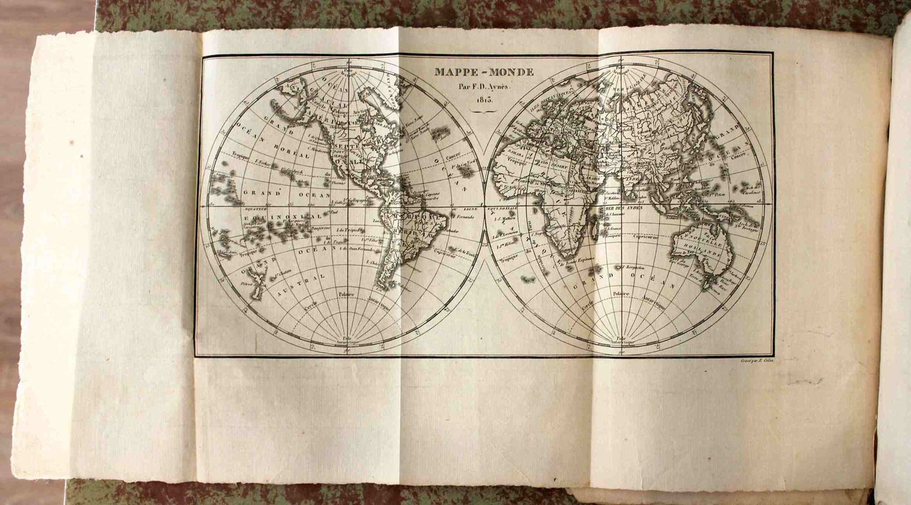 In 8° grande, pp. (8), 1111. Con 7 tavole incise in rame ripiegate: Mappamondo, Asia, Africa, America settentrionale, sistema tolemaico e copernicano, America meridionale, Europa. Brossura muta azzurrina originale (qualche difetto). Titolo calligrafato su etichetta di carta. Timbro privato di catalogazione sull'occhietto e al verso dell'ultima pagina. Buon esemplare, a pieni margini. Seconda edizione, arricchita delle tavole.
