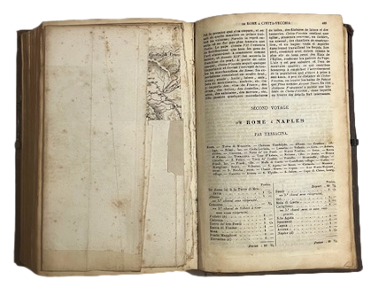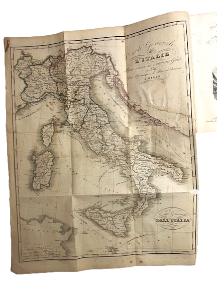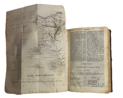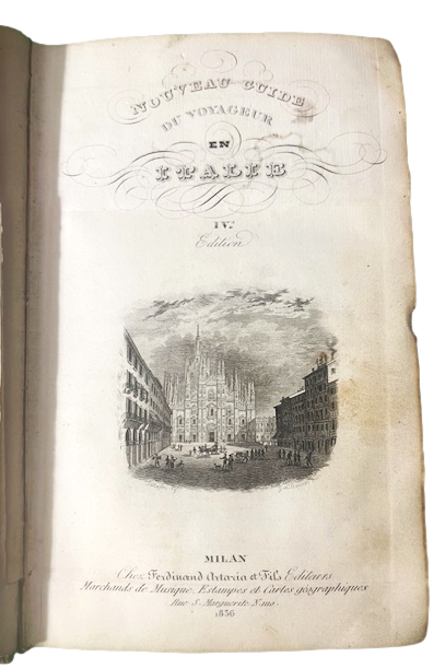 XXXII, 514, (6) pp. e 24 c. di tav. fuori testo (presente una carta in più rispetto alle classiche 23 carte di questa edizione), tutte più volte ripiegate a parte quella con la legenda dei Signes de Convention. Due tavole staccate dal testo con pecette antiche al recto a chiudere strappi, senza perdita di carta a parte una piccolissima mancanza al margine esterno di una carta che tocca la cornice. Legatura coeva in piena pelle rigida. Qualche strofinatura ed una piccola mancanza di pelle al margine superiore del dorso. Fermaglio metallico antico che tiene chiuso il volume. Nel complesso, a parte i difetti sopra descritti, buon esemplare. Quarta edizione della più famosa guida del viaggiatore in Italia dell'ottocento che ebbe enorme successo e numerose riedizioni durante tutto l'ottocento. Le carte contenute all'interno, più volte ripiegate: Carte générale de l'Italie en début d'ouvrage, Carte de Turin, Carte routière des différents passages des Alpes et du Piémont, Carte de Gènes, Carte de Milan, Voyage de Milan et Venise à Bologne, Carte de Bologne, Voyage de Milan et Venise à Trieste, Carte de Vérone, Carte de Venise, Carte de Trieste, Voyage de Vienne à Trieste, Voyage de Bologne à Ancone et de Bologne à Florence et à Rome, Carte de Florence, Voyage de Florence à Livourne et à L'Isle d'Elbe, Carte de Rome, Voyage de Rome à Naples, Carte de Naples, Environs de Naples (planche simple), Voyage de Naples à Reggio de Calabre et à Messine, Carte générale de la Sicile, Carte de Palerme. L'opera rappresentò una necessaria dotazione per tutti coloro che si apprestavano al Grand Tour d'Italie. Esemplare completo e con una carta in più rispetto alle canoniche 23 carte.