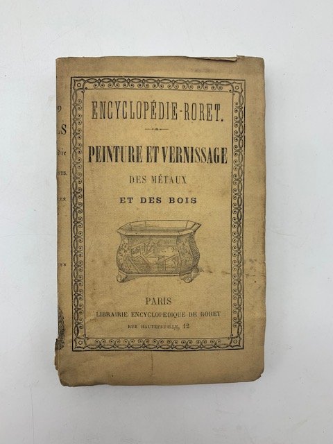 In 16 (cm 9,5 x 15), pp. (4) + 20472 di catalogo editoriale. Brossura editoriale. Manuale Roret per la verniciatura del legno e dei metalli con 'aggiunta della tecnica di utilizzo delle lacche giapponesi.