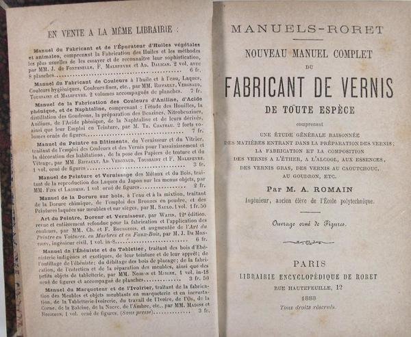 Mulo libraire éditeur, encyclopédie Roret. Paris, 1987. In/12 reluire en demi-basane marron, dos lisse, 204 pages. Nouvelle édition, revue et augmentée par S. Lacombe, ouvrage orné de figures. La composition et l'emploi des couleurs les plus appropriées à ces industries ; la préparation des métaux à décorer ; l'application des vernis ; l'imitation sur métaux des pierres précieuses, et des bois indigènes et exotiques ; l'ornementation des articles de ménage, etc . suivi de la reproduction des laques du Japon au moyen des vernis et des laques sur petits articles et objets de fantaisie.
