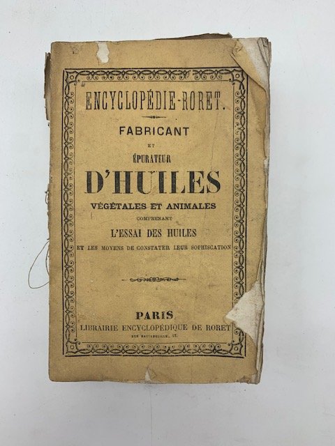 In 16 (cm 9,5 x 15), pp. III + (1 bianca) + 460 + 72 di catalogo editoriale con 8 tavole finali piu' volte ripiegate con figure incise in litografia. Dorso con danni restaurati. Pieghetta agli ultimi fogli. Brossura editoriale con piccola mancanza al piatto anteriore. Manuale Roret dedicato alla produzione di olii vegetale e animale.