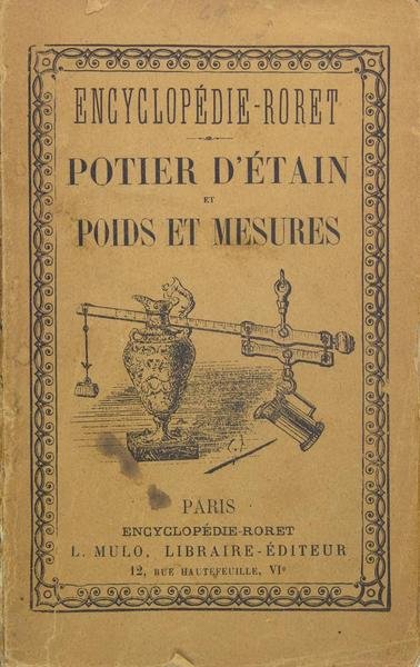 Paris, Encyclopédie Roret, 1909. In/16 broché, 227 illustrations in-texte, 468 p., 36 p. de catalogue. Dos cassé.Contenant la fabrication de la poterie d’étain, mesures à liquides, étains d’art poids en fonte de fer, poids en cuivre, mesures de capacité en fer-blanc, mesures en bois, mesures en longueur, mètres en bois, mètres en baleine, en ivoire, chaîne d’arpenteurs, balances, bascules, alcoomètre centésimal de Gay Lussac.