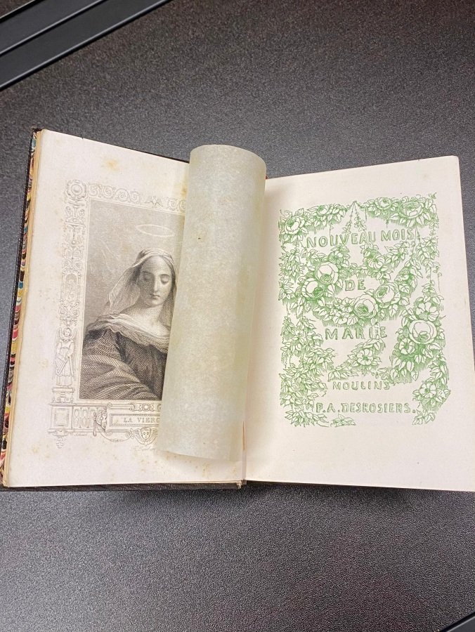 In-12° (cm. 12,7), legatura coeva in elegante tela nera, dorso liscio con titolo in oro e fregi romantici a secco, piatti inquadrati da un'ampia cornice decorata internamente con fregi sempre a secco, tagli dorati, risguardi marmorizzati; pp. [4] 372 in ottimo stato (lievi e sporadiche fioriture); con 1 bellissimo ritratto di Maria inciso in rame da Joubert all'antiporta fuori testo, protetto da velina, e 6 tavole litografiche fuori testo, sempre con veline; occhietto e frontespizio illustrati e incisi in litografia a colori; graziosissimi capilettera e finalini figurati e ramati; testo interamente inquadrato da cornici figurate in blu. Edizione non comune di questo volumetto religioso dedicato al mese di Maria. Ottimo esemplare conservato in astuccio coevo. (NO7)