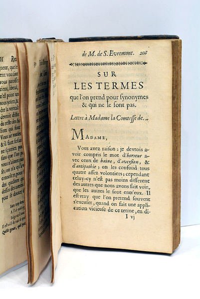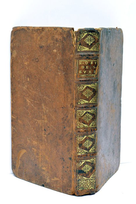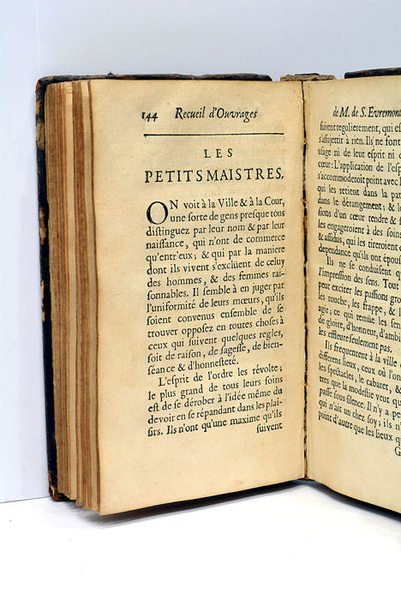 (1 feuillet blanc). 8 feuillets. 380 pages. (interversion de feuillets). (16 x 9,5 Cm). Pleine basane de l’époque, dos à nerfs orné (coiffes et coins un peu frottés). Charniers fendus. Manque de cuir au dos. Coiffes abimés. Pages jaunies. Edition Originale de ce recueil de pièces dont une seule peut être attribuée à Saint-Evremond Bon exemplaire à la date de 1701 (certains sont datés 1711). Etiquette imprimée ancienne : "M. Pegot, Colonel du Régiment du Roi, Infanterie Napolitaine".