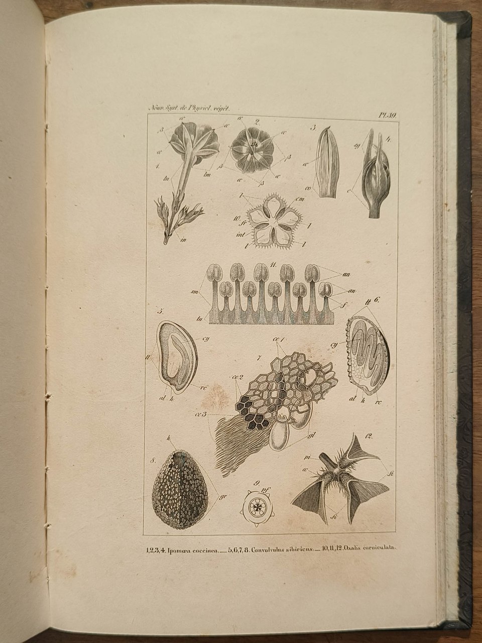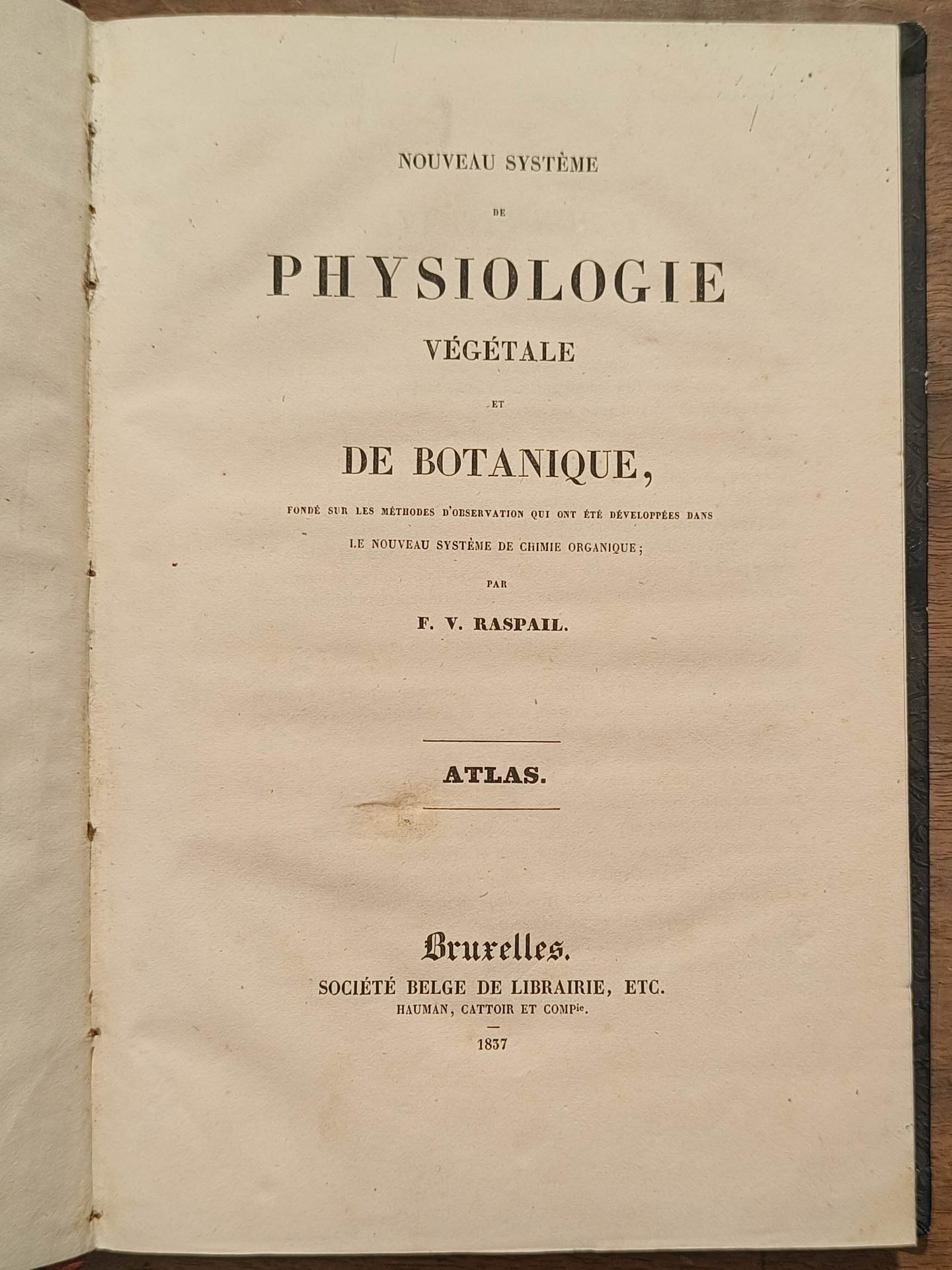 Nouveau système de physiologie végétale et de botanique, fondé sur les méthodes d'observation qui ont été développées dans le Nouveau système de chimie organique. Atlas, Bruxelles, Société belge de libraire, 1837. Cm 25,5. Pp. 54. Legatura in mezza pelle con autore, titolo, fregi e iniziali E.G.F. in oro al dorso. Carte con qualche macchia e fioritura. Il solo atlante 60 tavole fuori testo.