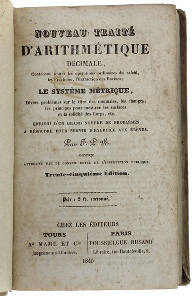 NOUVEAU TRAITE' D'ARITHMETIQUE DECIMALE, contenant toutes kes operations ordinaires du calcul, le Fractions, l'Extraction des Racines; le systeme METRIQUE, Divers problèmes sur le titre des monnaies, les changes, les principes pour mesurer les surfacesw
