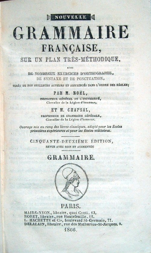 In-16° (cm 17,3x10,7), pp. 220, legatura coeva in mezza tela con normali segni d'uso, tagli decorati in blu. All'occhietto, firma d'appartenenza, timbro ovale "Libreria e cartoleria Costantino dell'Avo - Lodi", leggera abrasione che ha provocato due piccoli fori. Nella parte inferiore del contropiatto e dell'occhietto, conti (operazioni matematiche) a penna. Mancano le guardie. Alle pp. 9-10, mancanza nel margine bianco inferiore, che intacca leggermente una lettera dell'ultima riga di testo di p. 10; Alle pp. 11-12, piccola abrasione che ha provocato un forellino, senza perdita di testo. Quattro piccole macchie, che non alterano la leggibilità, alle pp. 65-66, numeri scritto a penna nel margine bianco inferiore di pagina 97. Nella parte inferiore di pagina 219, piccolo foro che intacca l'ultima riga di testo, provocando la perdita di 3 lettere, ma testo ricostruibile (il testo è: "verbe avec"). Per il resto in buono stato. Indice: Première Partie. Introduction. Des mots variables. Chapitre premier. Du Substantif; Chapitre II. De l'article; Chapitre III. De l'adjectif; Chapitre IV. Du pronom; Chapitre V. Du verbe; Chapitre VI. Du participe. Des mots invariables. Chapitre VII. De l'adverbe; Chapitre VIII. De la prèposition; Chapitre IX. De la conjongtion; Chapitre X. De l'interjection; Chapitre XI. De l'orthographe. Seconde Partie. De la syntaxe. Chapitre premier. Chapitre II. Du Substantif; Chapitre III. De l'article; Chapitre IV. De l'adjectif qualificatif; Chapitre V. De l'adjectif déterminatifs; Chapitre VI. Des pronoms; Chapitre VII. Du verbe; Chapitre VIII. Du participe prèsent; Chapitre IX. Du participe passé; Chapitre X. De l'adverbe; Chapitre XI. De la préposition; Chapitre XII. De la conjongtion; Chapitre XIII. De l'interjection; Chapitre XIV. De figures de sintaxe; Chapitre XV. Observations particulières; Chapitre XVI. De ponctuation; Chapitre XVII. De la prononciation et de la lecture; Chapitre XVIII. 823 locutions vicieuses. Table des matières.