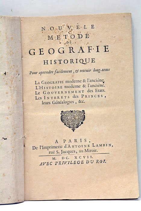 Nouvelle Méthode de Géographie Historique pour aprendre (sic) facilement et retenir long-tems la Géographie moderne et l’ancienne. L’Histoire moderne et l’ancienne. Le Gouvernement des Etats. Les Intêrets des Princes et leurs Généalogies, etc.