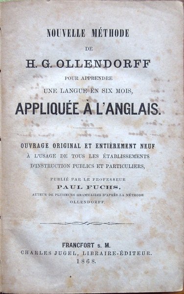 Nouvelle méthode de H. G. Ollendorff pour apprendre une langue en six mois, appliquée à l'Anglais. Ouvrage original et entierèment neuf . publié par le professeur Paul Fuchs, auteur de plusieurs grammaires d'après la méthode Ollendorff